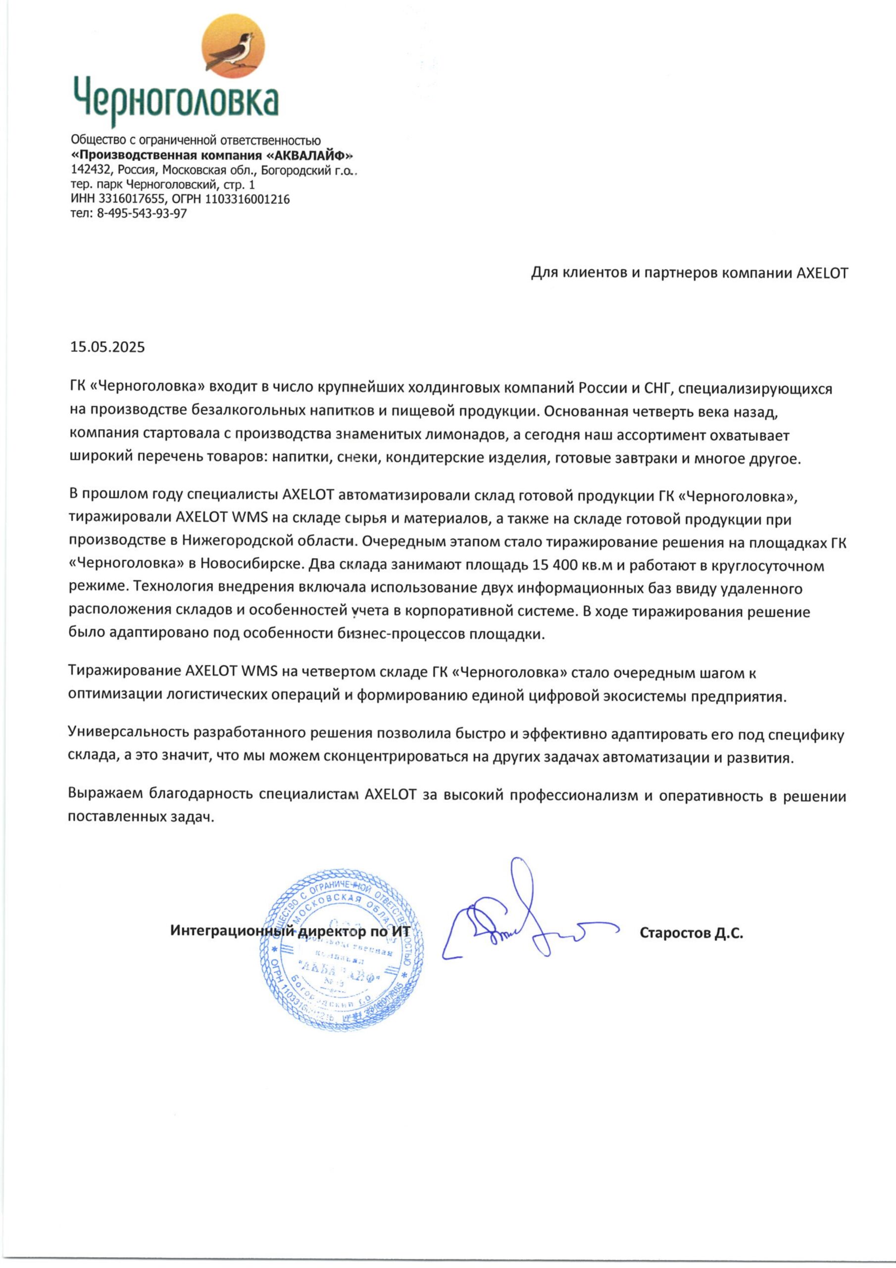 Продолжается тиражирование решения по управлению складами в ГК «Черноголовка» – уже четвертая площадка переведена под управление AXELOT WMS.